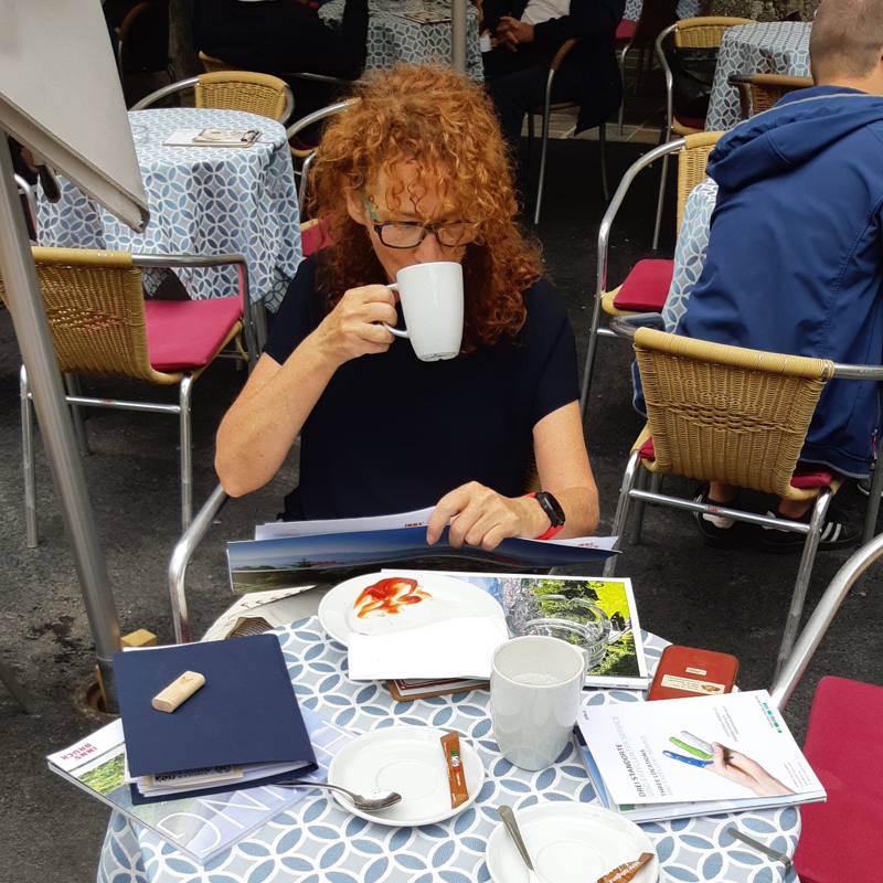 We stappen uit het busje en de man van het andere koppel pakt zijn telefoon en start zijn GPS. Hij gebruikt de app Outdoor-Active pro, waarop de GPX bestanden die door de organisatie geleverd worden, het uitstekend doen. Ze doen het zo goed, dat hij steeds zijn eigen route maakt. Het koppel, dat al wat ouder is, loopt liever over Forstwegen dan over de Wurzelpfaden. Wij wandelen nog steeds met de uitgeschreven route en vinden juist de tussendoorpaadjes het leukst. Onze wegen scheiden dus. Hoewel we ze in de loop van de dag steeds tegenkomen. Wij lopen harder, maar maken veel omwegen en vinden het leuk om hier en daar koffie te drinken, te lunchen of gewoon in het bos of op een mooi uitkijkpunt te gaan zitten. Het andere stel wandelt langzamer, maar efficiënter en gaat gestaag door.