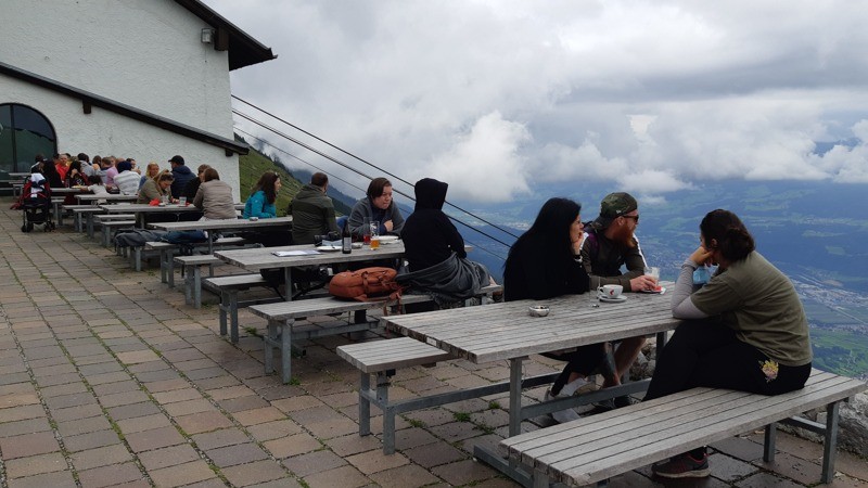 Het restaurant op de top nodigt uit om iets te drinken. We zien dat we van hieruit verschillende wandelingen kunnen maken. Maar omdat morgen onze 6 dagen wandeltrektocht begint, slaan we dat vandaag over. We willen zoveel mogelijk zien van de stad Innsbruck.