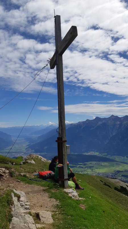 Op het uitzichtpunt met het houten kruis stoppen we voor een pauze. Hier moeten we beslissen welke route we gaan lopen: Gaan we hoog over de Sellrainer Bergen via de Pirchkogel (2828 m) naar Kühtai (rood) of nemen we de Kaizer-Franz-Josef-Weg (blauw). Die keuze hebben we eigenlijk gisteren al gemaakt. De eigenaar en berggids van het Bergland Hotel vertelde ons dat de rode route enkele lastige passages heeft die niet echt geschikt zijn voor mensen met hoogtevrees. Daarbij had hij ook nog eens gehoord dat er delen weggeslagen zouden zijn. Maar daar was hij weer heel luchtig over. “Dat zullen ze wel gerepareerd hebben, anders laten ze je er niet overheen gaan.” Hans trok groen weg bij de gedachte alleen al.