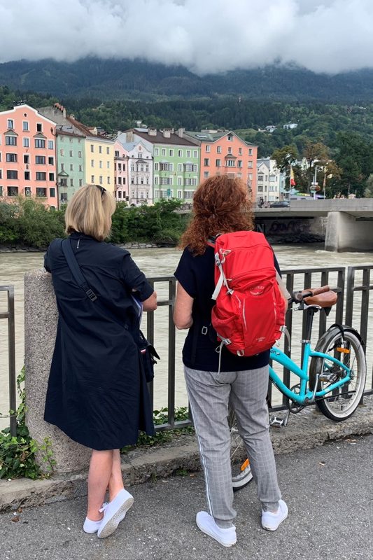 We wandelen langs het nieuwe muziekgebouw, het Hebelinghuis, langs oude stadmuren, door romantische straatjes, drinken koffie onder het huis met het gouden dak en steken ook nog even de Inn over. Natuurlijk leggen wij ook de karakteristieke huizen langs de Inn vast op de gevoelige plaat. De oude binnenstad van Innsbruck is compact en vol met bezienswaardigheden. Het is superleuk om hier met gids Mary te lopen. Een echte aanrader.