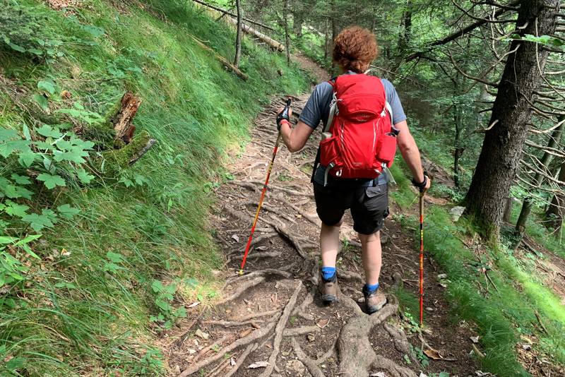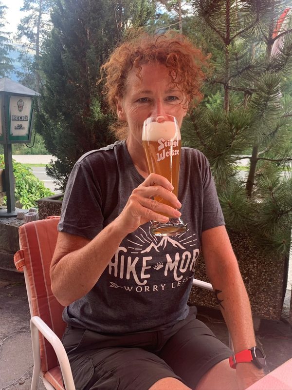 Dan leer ik vanuit de Duitse beschrijving een nieuw woord: Wurzeligen Steig. Dit wandelen over wortels zullen we de komende dagen nog veel doen. Ik houd van dit soort paadjes. Via smalle wortelpaden dalen we het laatste stuk af tot we weer in het dal staan. Daar nemen we de bus naar ons volgende hotel. Hoe de bussen lopen staat goed beschreven in het boekje. Dat is allemaal prima geregeld. Met de vervoerskaart die bij het pakket van de Innsbruck Trek zit kunnen we gratis reizen en hoeven ons niet druk te maken over het kopen van een kaartje. Ongeveer voor de deur van Hotel Bergland Obsteig stappen we uit. Dat ziet er goed uit! Een heerlijk terras en binnen wacht het zwembad en wellness gedeelte op ons. Eerst maar een biertje.