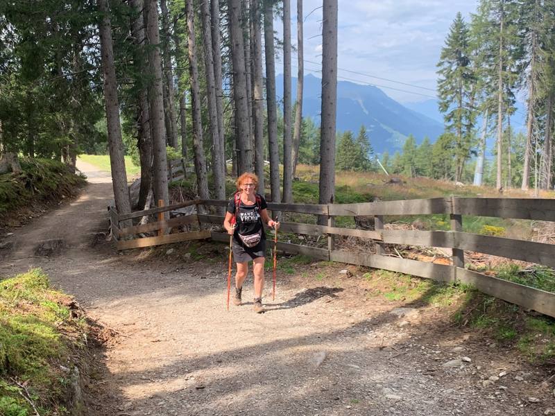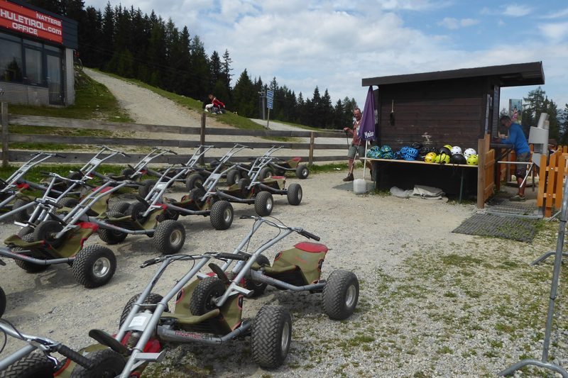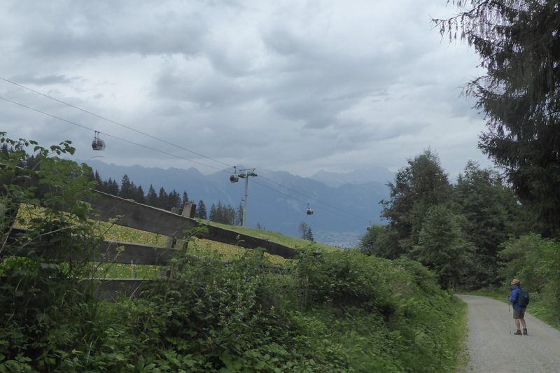 Als we uit het bos komen staan we voor de Götzner Alm. De eerste Alm vandaag die open is. Dat vraagt om een stop voor koffie met iets lekkers. Het heet niet voor niets de Almenweg. Na onze stop wandelen we verder over Forstwegen. Het landschap wordt opener en we kunnen verder kijken. Op sommige plekken hebben we een doorkijk naar het dal. We komen aan bij Mutterer Alm. We staan bij het bovenste station van de Mutteralmbahn. Het is er druk. Veel dagjesmensen komen met de gondel omhoog. Je kunt er van alles doen. Met een kleine wandeling zit je boven op de top van de Pfriemesköpfl. Er is een waterpark voor de kleintjes en je kunt vanaf hier met je mountainbike op een speciaal aangelegde baan naar beneden rijden. Je kunt ook een karretje huren en daarmee, over de weg, naar beneden sjezen. Ik zie het niet zo zitten. Dat gaat mij veel te hard. Later hoor ik dat er per dag minimaal 3 keer een ambulance of helikopter komt om mensen af te voeren naar het ziekenhuis. In de zomer!