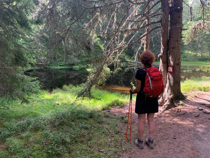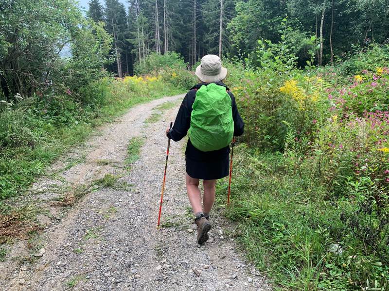 Wij wandelen naar beneden en nemen de route langs het Hirschlacke, een prachtig sprookjesachtig meer. We wandelen weer dwars door het bos en navigeren op rood-wit geverfde stenen en bomen. Al met al is het nog een flinke afdaling tot we beneden aankomen in Mutters. Voor het eerst draait het weer om. Tot nu toe hebben we alleen maar heerlijk nazomerweer gehad met af en toe zelfs flinke zon en hoge temperaturen, maar nu begint het zachtjes te regenen. In Mutters wacht Sporthotel Schieferie op ons. Omdat het nog best vroeg in de middag is, maken we een afspraak om te gaan zwemmen. We hebben het zwembad onder in het hotel helemaal voor onszelf. Coronaregels: het zwembad mag niet gedeeld worden.