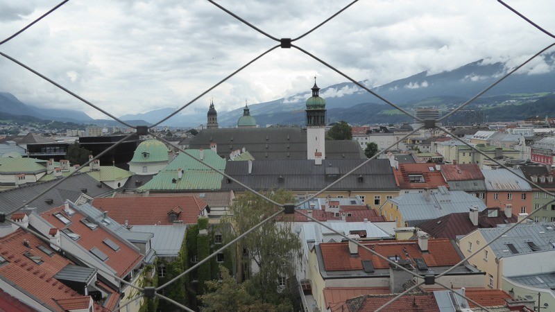 We activeren de kaart en starten bij de toren die we beklimmen willen. Het is de Stadtturm Innsbruck, de stadstoren van Innsbruck. Deze toren uit 1450 staat midden in de oude stad en geeft een prachtig uitzicht. We kunnen ons uitstekend oriënteren. We zien de rivier de Inn die de stad doorsnijdt, en kunnen goed zien dat Innsbruck in een dal ligt met aan de ene kant de Nordkette met het treintje en de liftbaan naar boven en aan de andere kant de imposante Bergisel Springschans. Om dit alles te kunnen zien moesten we 133 treden omhoog en een glazen plateau over. Dat laatste vond Hans minder leuk. Hij heeft namelijk nogal last van hoogtevrees. Hij blijft ook met zijn rug tegen de muur staan als we op de uitkijkring van de toren staan. Het uitzicht maakt gelukkig dat hij het bijna vergeet.