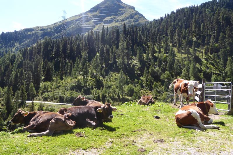 Het eerste deel van de route is voor iedereen blauw. We wandelen voornamelijk over Forstwegen naar boven. We hadden ons al verheugd op de Feldringalm, maar ook die is gesloten. We wandelen door en komen dan op een stuk wat heel veel indruk maakt. We lopen over een Hochplateau waar koeien grazen, de lucht weerspiegeld wordt in bergmeertjes en waar Heidi und Peter elk moment kunnen komen aanhuppelen. Dit is een Oostenrijkse Alpenweide, zo mooi als ik nog niet gezien heb.