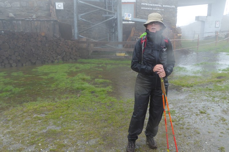 We nemen de gondel naar boven naar het Bergstation Patscherkofelbahn. Hier staat ons een prachtige wandeling te wachten over alpinegebied. Ik had me er echt op verheugd. De regen komt nu met bakken uit de hemel. Eerst maar eens koffie. In restaurant Das Kofel moet je een geweldig uitzicht hebben. De foto’s aan de wand liegen er niet om. Maar nu is alles grijs.