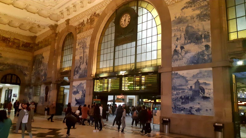 Om van het vliegveld naar de stad te komen kun je de metro nemen. Ik ging naar het station Sao Bento in het centrum van Porto, naast de kathedraal. Vanaf de aankomsthal volgde ik de bordjes naar de metro. Ik werd geholpen door een personeelslid die standaard naast de ticketmachine staat om je te helpen een kaartje te kopen. Dit, op een OV pas lijkend kartonnen kaartje, kostte mij € 2,70 voor een enkele reis. Dit is inclusief 50 cent voor het kaartje dat opnieuw oplaadbaar is. Naast de ticketautomaat staat een paal waaraan het kaartje geactiveerd moet worden. Er rijdt maar 1 metro vanuit het vliegveld, dus dat kan niet mis; Richting Estadio do Dragao. Ik moet 1 x overstappen op station Trinidade. Anders dan in Nederland moet je daar weer opnieuw je kaartje activeren. Daar de gele lijn nemen richting Santa Ovidio. Uitstappen bij Sao Bento, middenin het historische centrum van Porto.
