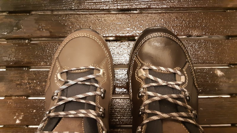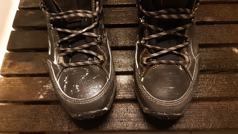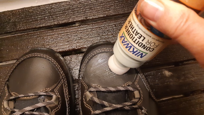 Laat ik nu net een prachtig paar nieuwe wandelschoenen hebben. Het is zo weinig werk om ze goed te behandelen. De schoenen zijn nog niet gedragen, dus ik hoef ook niets schoon te maken. De conditioner moet wel op nat leer aangebracht worden, dus ik maak de schoen nat onder de kraan. Daar schrik ik eigenlijk wel van. De schoen neemt meteen het water op. Helemaal geen waterdruppels die van het leer afparelen. Dit is dus echt nodig.