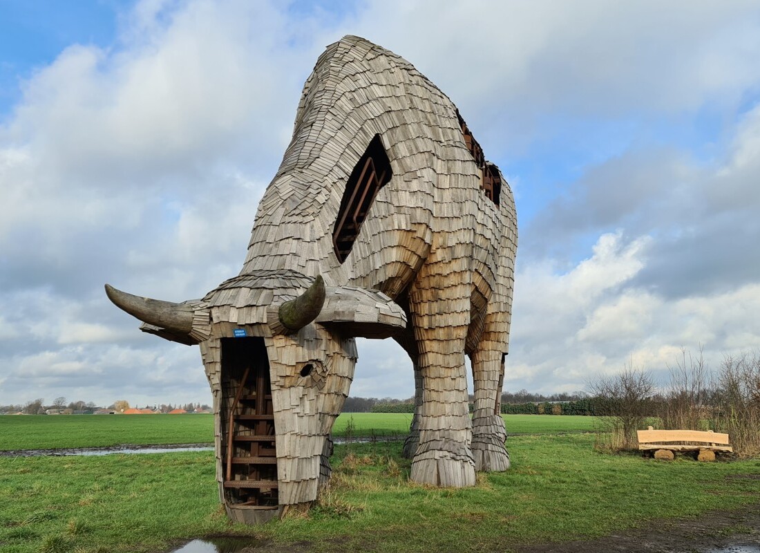 Ook een ander letterlijk hoogtepunt staat hier. Ik zie de enorme koe van 8 meter hoog, al van verre staan. Wat een bouwwerk! Het kunstwerk met de naam De Melkfabriek, kan beklommen worden. Dat laat ik me geen twee keer zeggen.