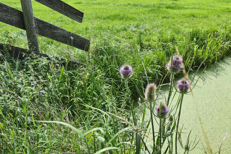 Ik loop door langs de openbare weg. Gelukkig rijdt hier bijna geen verkeer. Links en rechts zijn weilanden. Het valt me op hoeveel verschillende soorten bloemen en vogels ik zie.
