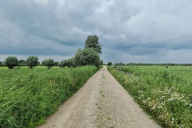 Ik wandel aan de rand van een nieuwbouwwijk en kijk rechts over de weilanden van het Groene Hart.