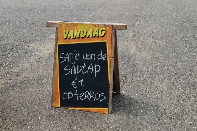 Dan kom ik weer in de bewoonde wereld. Een bescheiden bord nodigt me uit tot het drinken van een zelfgeperst sapje. Dat laat ik me geen twee keer vragen. Bij fruitbedrijf Van Lint staat naast de schuur een grote picknicktafel, waar ik een andere wandelaar tegenkom. We raken aan de praat. Zij wandelt met een veel te zware rugzak van Hoogvliet naar Zwolle. Geweldig! Ik hou hiervan. Gewoon een route met Komoot uitgestippeld, geen enkele ervaring in het wandelen van meerdaagse afstanden, maar gewoon gaan. Mét een reisföhn en nog veel meer spullen in de 60 liter rugzak die waarschijnlijk niet gebruikt gaan worden. Gelukkig kan ze er zelf ook om lachen. Jammer dat we niet dezelfde kant op moeten.