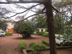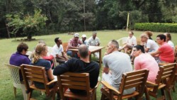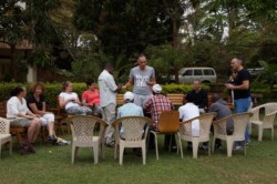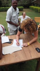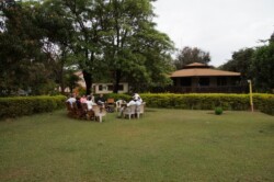 2 September 2014. Het is heerlijk wakker worden na zo’n goede nachtrust. Aan het voeteneind van onze bedden ligt de chaos van onze twee zorgvuldig gepakte koffers. Vandaag gaat er toch nog wat denkwerk zitten in wat achterblijft en wat niet. ‘We zijn er echt’, denk ik. Ik kan eindelijk zien hoe Afrika er hier uit ziet. Dat valt toch wel wat tegen. Het kan overal zijn: tuin, mooie bloemen, bomen, grasveldje en de oprijlaan die ik nog van gisteravond herken. Het is een aangename 22 graden en het is wat heiig. Dat zorgt ervoor dat we geen uitzicht hebben op de berg. De Kilimanjaro blijft nog verborgen.