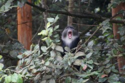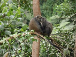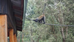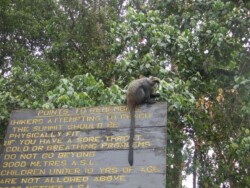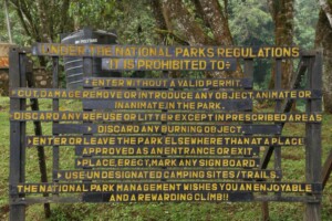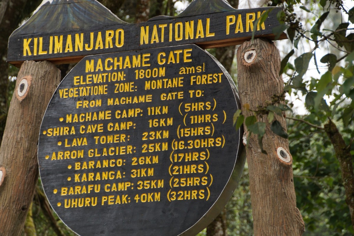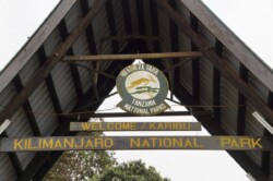 We staan aan de voet van het tropisch regenwoud, verschillende soorten aapjes zitten in de bomen en vermaken de toeschouwers. De borden vertellen ons de regels van Kilimanjaro National Park. We maken een groepsfoto met onze FIT-shirts aan, speciaal voor dit doel aangetrokken.