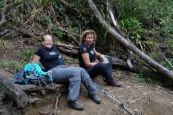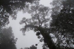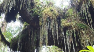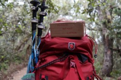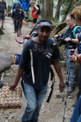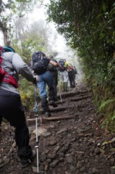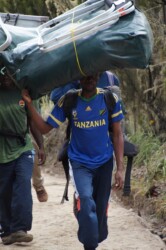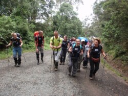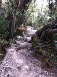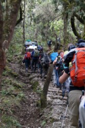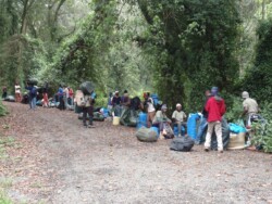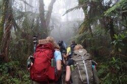We eten nog wat, maken nog wat meer foto’s en dan gaan we op weg. Letterlijk en figuurlijk. We lopen het eerste stuk op een weg. Het stijgingspercentage is meteen fors en we worden gemaand om rustig te lopen. Pole, Pole. Langzaam, langzaam. We worden ingehaald door de dragers die zich met de meest vreemdsoortige pakketten op hun rug langs ons spoeden. Er is 1 vrouwelijke drager, Monica. Ze hoort bij een andere groep dan de onze maar wanneer we haar tegenkomen krijgt ze luid applaus en roepen we “Jambo!” Wat iets is als: hallo/hoe gaat het. Dat zal zich de komende dagen nog vele malen herhalen. Wij zijn fan van Monica. De weg gaat over in een pad en wordt steeds smaller en het wordt steeds vochtiger in het bos. De mist zit tussen de bomen. Spookachtig mooi.