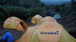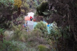 Het avondeten smaakt goed, bijzonder hoe goed de koks een lekkere maaltijd neer kunnen zetten in deze omstandigheden. Onze groep zit verdeeld over de twee tenten. Wat opvalt is dat in iedere tent een van onze gidsen mee eet. Gezellig, maar als we hem bevragen blijkt dat het ook echt is om ons eetgedrag te observeren. Hoogte kan stevig je eetlust verminderen. Ze blijven bij ons om ons dus ook aan te moedigen te eten wanneer we daar geen zin in hebben. Dit speelt nu nog niet, we hebben ook stevig geoefend met eten dus de vraag is of we daar wel een probleem mee krijgen. We bevragen hem wat over zijn werk en leven, zijn verhaal is bijzonder. Opmerkelijk is wel het fatsoen van deze Tanzaniaan en zijn collega’s, het is een soort fatsoen zonder belerend te zijn, behulpzaam zonder kruiperigheid, trots zonder arrogantie en een diep respect voor de natuur. Hij wil ons geen scheldwoorden leren in Swahili, helaas. Na een dag toeristenzinnen willen we nu wat echte taal maar hij geeft niet toe onder de onderhandelingsdruk van buddy Sally. We voelen ons als brutale Nederlanders wel lomp in vergelijking met onze fatsoenlijke gids Bosco, dus ook dit wordt getoetst: van alle toeristen, hoe erg zijn de Nederlanders om te begeleiden? We zijn niet zo erg als de Aziaten wordt ons na wat gepeins verteld. “En die zijn het ergst?” Vraag ik nog voor de zekerheid.