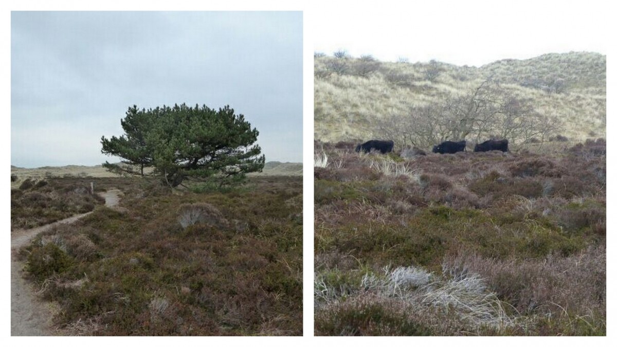 We lopen over brede paden tot we bij een hek aankomen. Hierachter lopen Wagyu-koeien los rond. De van oorsprong Japanse koeien worden door Staatsbosbeheer ingezet om te voorkomen dat het duin dichtgroeit met struiken en gras. Als er geen begrazing plaatsvindt, worden de duinen eentoniger en verdwijnen er langzaam soorten planten en dieren, zoals tapuit, zandhagedis en veel soorten vlinders. Van een bioloog die we onderweg tegenkomen horen we dat het vrij uniek is om de koeien tegen te komen. Hij heeft ze al 3 maanden niet gezien terwijl hij hier heel regelmatig komt. Dat is nu jammer, we hadden ze graag gezien. De Wagyu-koeien zijn overigens heel vriendelijke dieren. Als je ze met rust laat, gebeurt er niets.