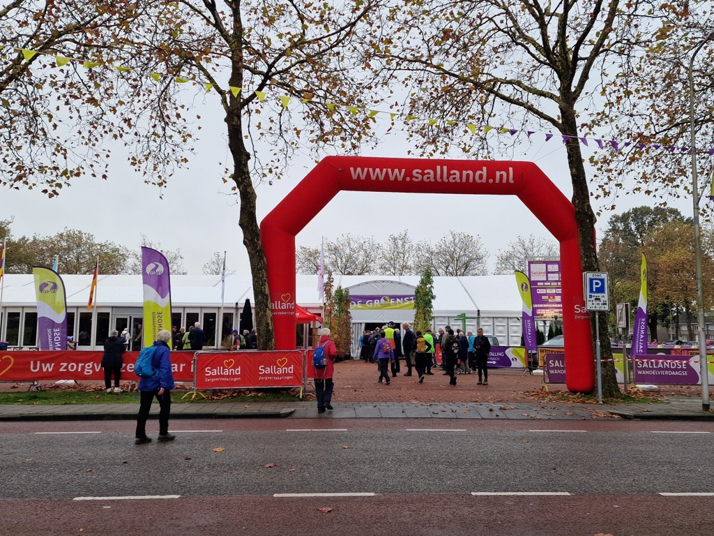 Het vertrekpunt van de Wandelvierdaagse is in Raalte. Ik heb op de website gelezen dat het parkeren hier goed geregeld is. Met een lange rit vanuit Enkhuizen achter de rug ben ik blij dat dit inderdaad vlekkeloos verloopt, er is plek genoeg. Terwijl ik richting de startplek wandel, hoor ik gezellige muziek uit de grote tent komen. Een goed begin van de dag!