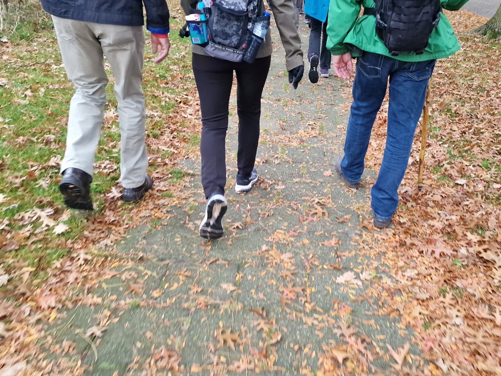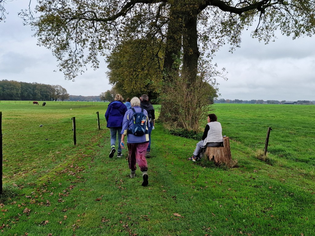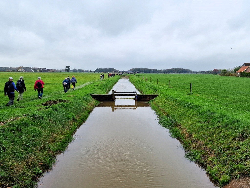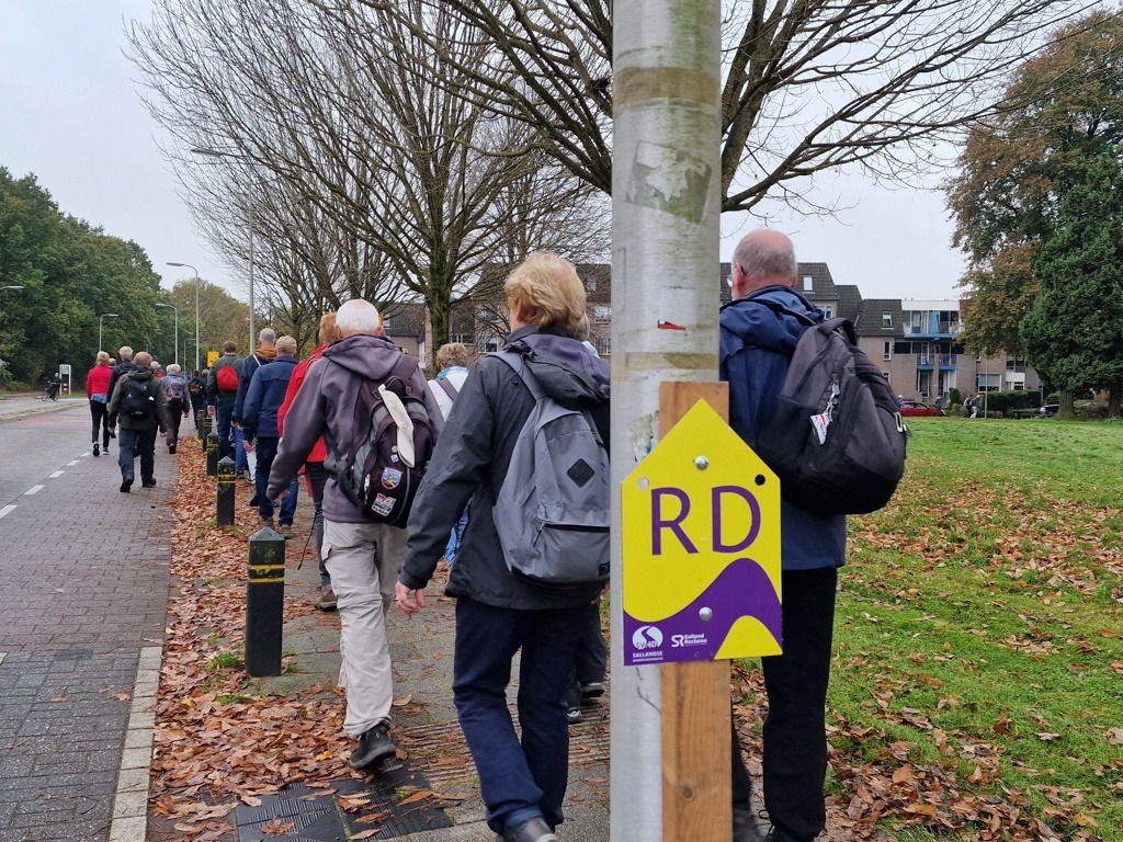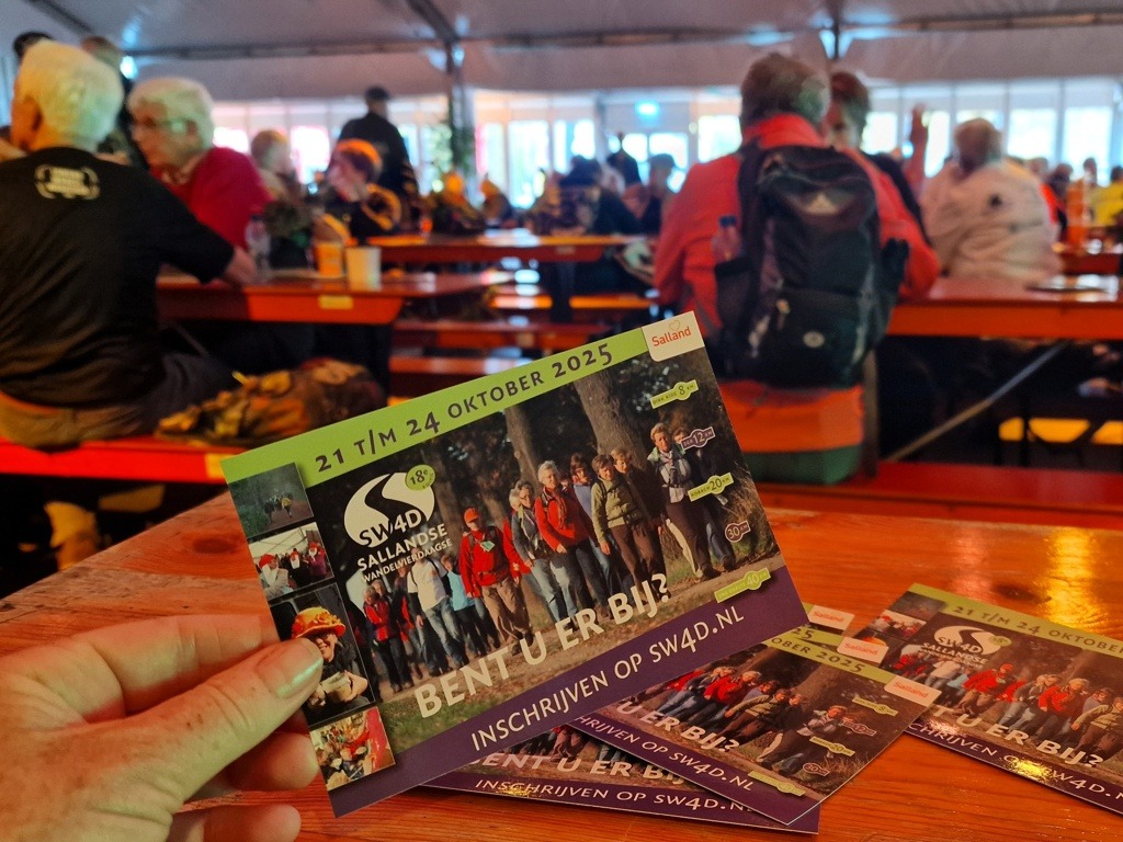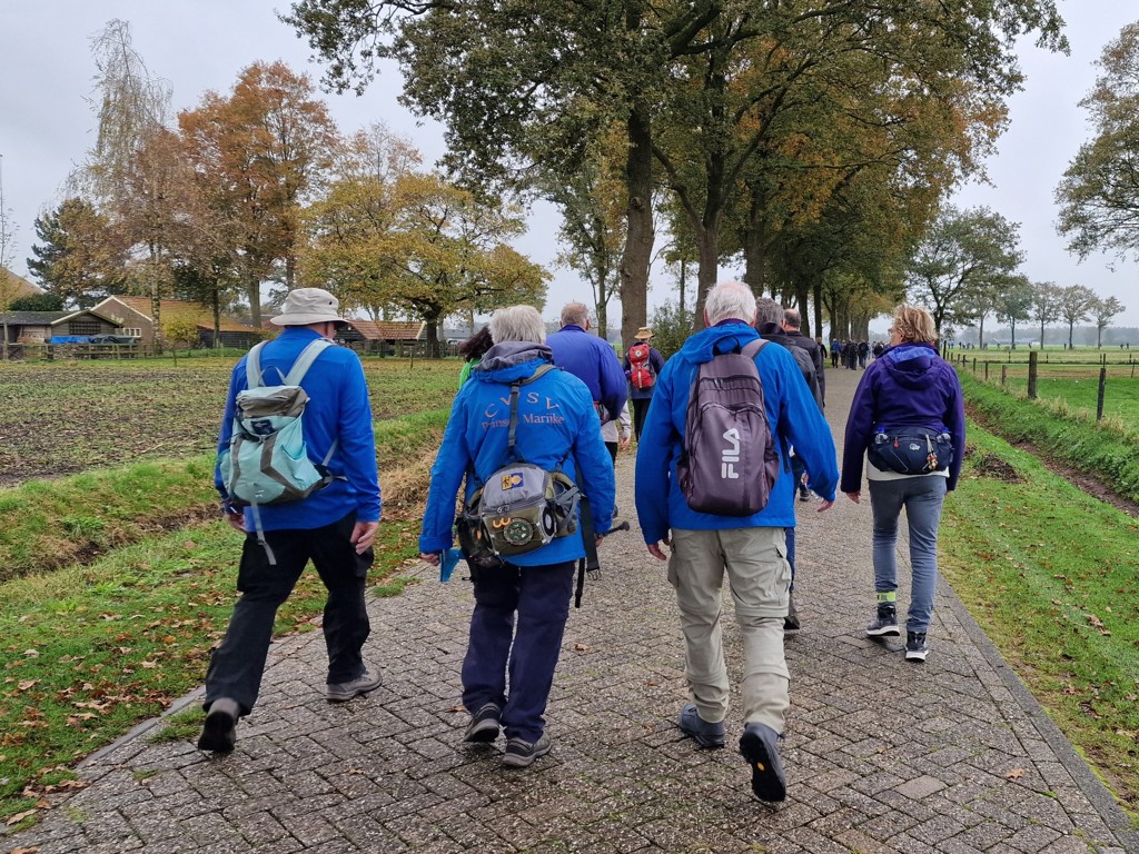 Ik heb gekozen voor de 20 km-route, die tussen half tien en half elf van start gaat. Na het inschrijven geniet ik nog even van het mannenkoor dat vrolijke liedjes zingt. Als de dubbele deuren opengaan, sluit ik aan bij de stroom van enthousiaste wandelaars. Twee verklede dames wuiven ons uit, en met een glimlach stap ik het Sallandse platteland op. Het is herfst en de bomen zijn al aan het verkleuren en soms wandelen we door een dikke laag bladeren. Hoewel het weer wat miezerig is, zit de stemming er goed in. Ook al loop ik alleen, onderweg maak ik al snel leuke praatjes met andere wandelaars.