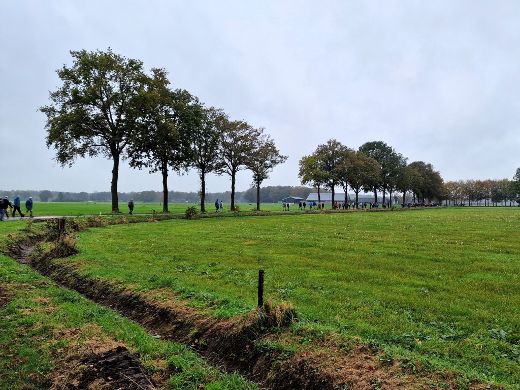 De laatste zeven kilometers zijn aangebroken. Het tempo zit er lekker in en ik vind steeds aansluiting bij groepjes die flink doorstappen. Het is mooi om te zien hoe een lang lint van wandelaars zich een weg baant door het Sallandse landschap. Dit deel van de route gaat voor een deel door bos en vormt een mooie afwisseling met de open plattelandswegen.