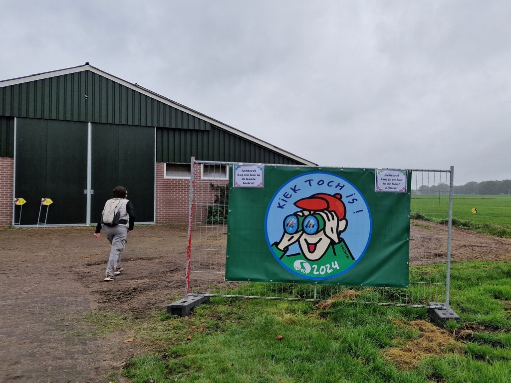 Ik ga weer verder. De miezer is trouwens gestopt en zal ook niet terugkeren. Het weer is nu heerlijk om te wandelen, en ik geniet volop van de mooie huizen en de boerenerven waar we langs komen. De route voert ons over weilanden en langs water, en zelfs over het erf van een koeienboerderij. Tot mijn verrassing wandelen we dwars door de stal – wat een unieke ervaring!