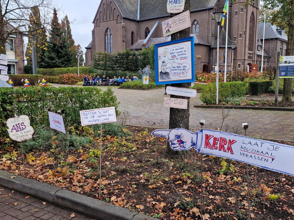 In Broekland worden we warm ontvangen. Overal hangen de vlaggen uit. Op het 13-kilometer-punt treffen we het tweede rustpunt. Lokale ondernemers verkopen streekproducten, en het plein naast de kerk is feestelijk versierd. De kerk is open voor bezoek en de bankjes rondom het plein zitten vol met pauzerende wandelaars. In het café tegenover de kerk is het gezellig druk. Ik heb gelezen dat hier de film “Wat je altijd al wilde weten over Broekland” vertoont wordt. Toch besluit ik, na een korte blik naar binnen, buiten een rustig plekje te zoeken voor een kleine pauze.