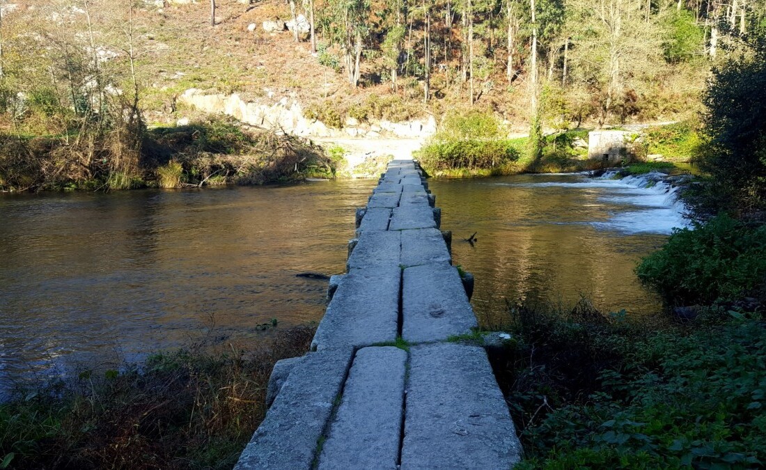 Het bospad is smal en overbrugt flink wat hoogteverschil. Veel dalen over grote en kleine stenen. Het is droog, dus niet glad. Toch is het uitkijken, ik ben blij dat ik mijn wandelstokken bij me heb. Ik krijg allerlei fantasieën over vallen en mijn beide benen breken en hoe ik dan hulp moet inroepen. Volgens mij komt hier zelden iemand. Ik schik me dan ook helemaal te pletter als er ineens iemand achter me staat. Het blijkt Tim uit Cyprus te zijn. Een pelgrim die vanaf Lissabon loopt.