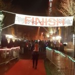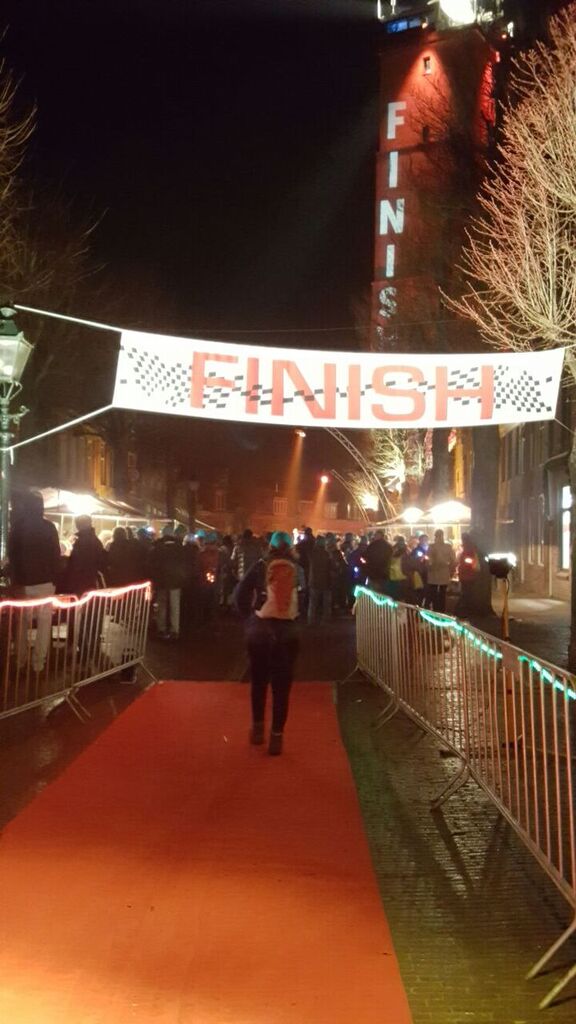 De kilometers gingen langzaam voorbij. Uiteindelijk na 44,5 km wandelen liepen we op de rode loper. Het was tien voor half 2 toen we onder het finishbord doorgingen. Anja kon er nog een vreugdesprong voor de foto uitgooien, ik was niet meer in staat om er een glimlach uit te persen.