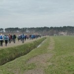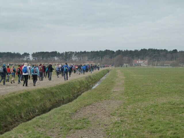 Een stempel bij de start en daar gingen we. We liepen vooraan bij de start maar dat was natuurlijk niet handig. Wij zouden een langzaam tempo lopen dus alle 348 wandelaars moesten ons inhalen. En dat deden ze. Met gezwinde spoed gingen zij er vandoor. We liepen al snel achteraan. Na 10 km hielden we even pauze met een ander stel. Zij waren ook niet van het snelle lopen, vertelden ze. Het was een beetje stuivertje wisselen tussen ons. Soms haalden wij ze in, soms haalden zij ons in.