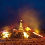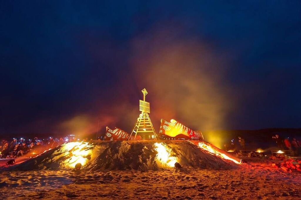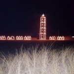 Heel in de verte zagen we hoog in de lucht een soort lichtcarrousel. Het leek wel een kermisattractie. We liepen en we liepen, maar kwamen maar niet dichterbij. Het humeur was al ver onder het nulpunt. Verder was er niemand meer. We hadden al ruim 32 kilometer gelopen. Bij het licht in de verte zou waarschijnlijk de plek zijn waar de 16 km lopers het strand opkomen. Dat was ook zo. Eindelijk meer mensen. Geen lopers maar vrijwilligers die rond een groot kampvuur zaten. De huifkar stopte daar. Wij liepen door, blij van het ding verlost te zijn. De carrousel bleek een installatie met witte wieven te zijn. Prachtig. Maar wij hadden er weinig oog voor. We wilden verder. Weer een donker stuk strand over.