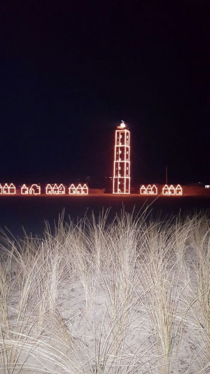 Twee keer dachten we dat de volgende stempelpost in een strandpaviljoen moest zijn. We ploegden door het mulle zand naar boven, maar daar was niets. We werden doorverwezen naar het volgende strandpaviljoen. Weer niets. De strandopgang was wat lastig te vinden en zwaar door het mulle zand. We waren nog steeds alleen en er was niemand om achter aan te lopen. Uiteindelijk kwamen we toch bij de Reddingsbrigade aan. Daar was het feest! Drank en muziek en blije mensen. Prachtige lichtobjecten waar we amper meer van konden genieten. Even zitten en weer door. Lekkere cranberrycake kregen we trouwens. Die energieboost was wel nodig.