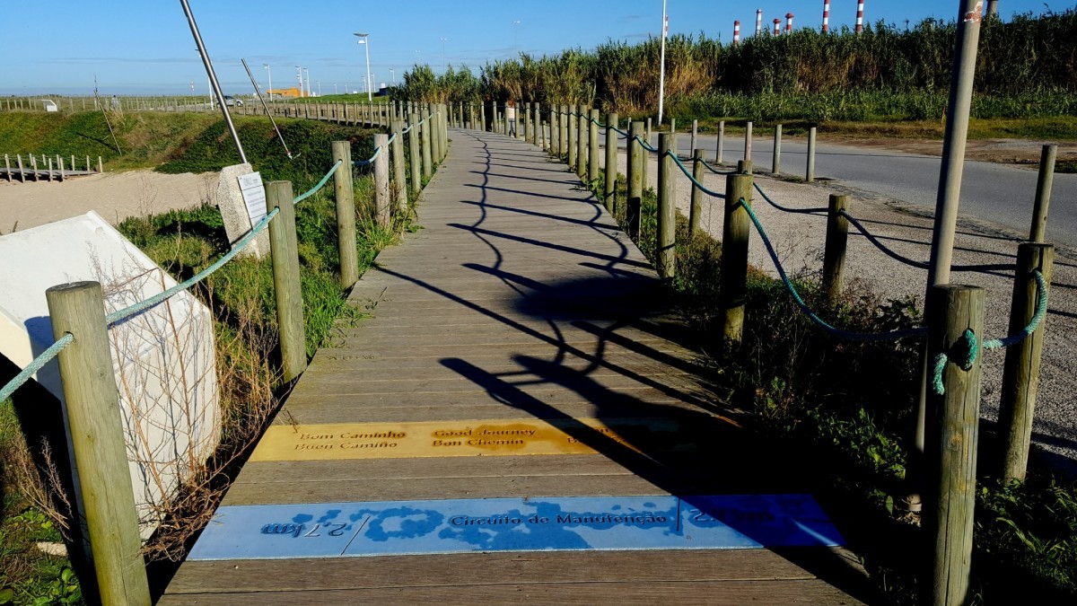 Aan het einde van de boulevard startte een houten wandelpad. In 6 talen werd me een goede camino toegewenst. Niet in het Nederlands overigens. 😀