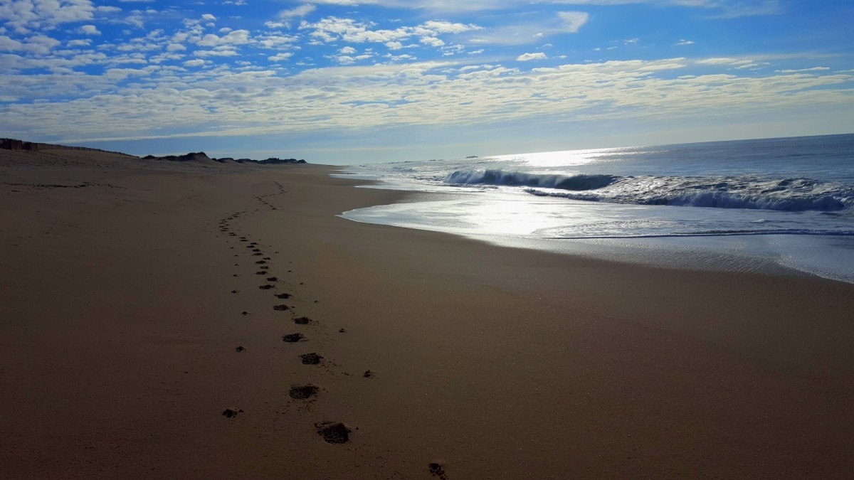 Ik loop alleen maar te genieten. De zee is prachtig. Flinke golven, er wordt zelfs hier en daar gesurft. De zon schijnt, er is nagenoeg geen wind en de temperatuur loopt nog flink op. Foto’s zeggen vast meer dan mijn woorden: