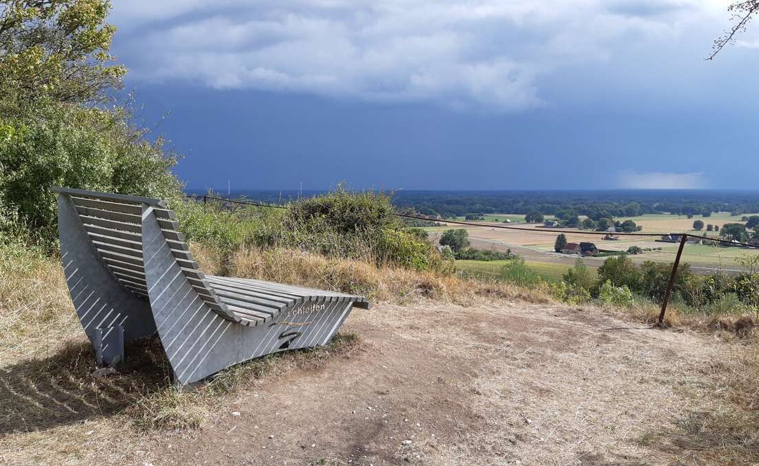 We wandelen een stukje langs de rand van Brochterbeck en gaan dan onder de weg door. Een steile klim brengt ons op de rand van een voormalige steengroeve. We hebben een prachtig uitzicht. De enorme lig-wandelbank lonkt maar dat kunnen we beter niet doen. In de verte zien we forse buien aankomen. Het ziet er prachtig uit maar echt veel zin om zeiknat te worden hebben we niet. We wandelen snel verder maar kunnen het niet laten om foto’s te maken van het fantastische landschap met de dreigende luchten.