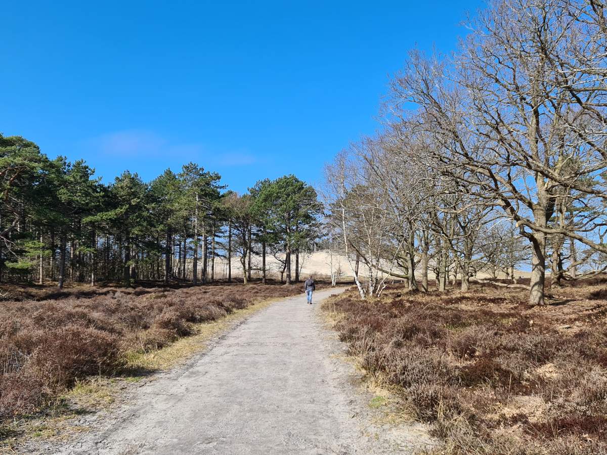 We gaan de duinen door. Dit is geen wandeling voor mensen die wat moeilijker lopen. Dit is echt ploegen door rul zand. Ik probeer nog een beetje om de wat hardere zijkanten van de paden op te zoeken, maar dat lukt natuurlijk niet altijd.