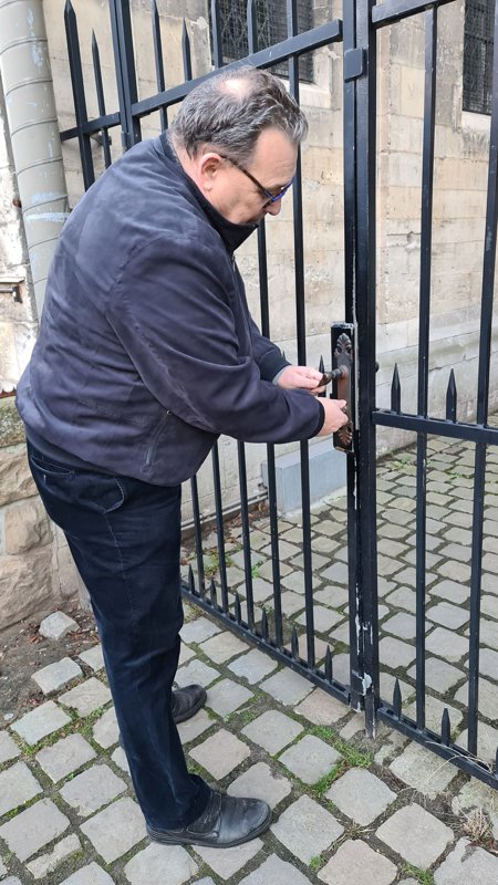 Stadsgids Henk Denissen opent de Munsterkerk van de achterzijde.
