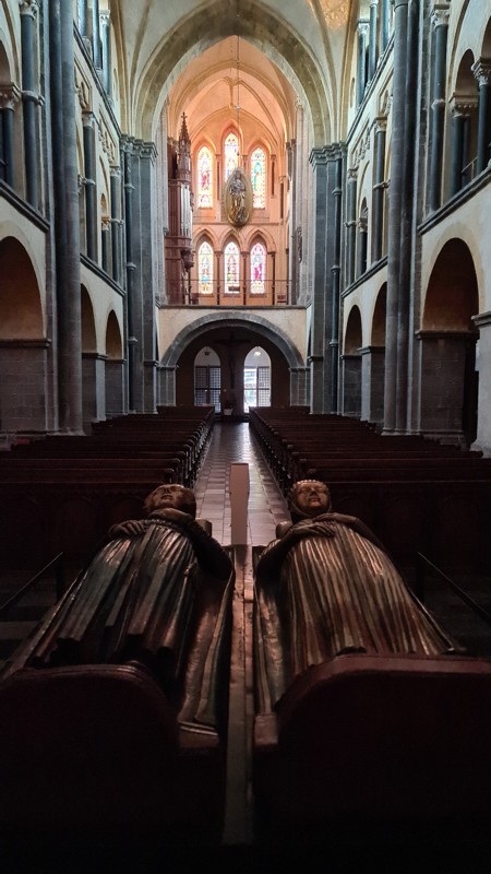 Stadsgids Henk heeft bij elk gebouw een mooi verhaal. De meeste indruk maakt op mij toch de Munsterkerk met het praalgraf van Gerard, graaf van Gelre († 1229) en zijn echtgenote Margaretha van Brabant († 1231). Ze liggen met halfopen ogen en kijken naar boven. Daar helemaal in het nokje van de kerk staat het beeld van Christus Triomfator. Volgens Henk moet je die eerst passeren op weg naar de hemel, nog voor je bij Petrus en de hemelpoort komt. Daarom houden ze die goed in de gaten.