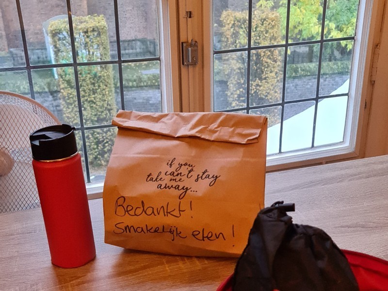 Heerlijk geslapen. Ik sta op met een kopje koffie en zie dat mijn lunchpakket al voor me klaar staat. Even spieken: jawel hoor. Ik heb vanmiddag weer overheerlijke bonbons.