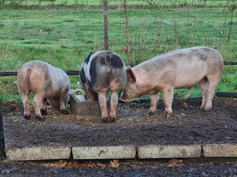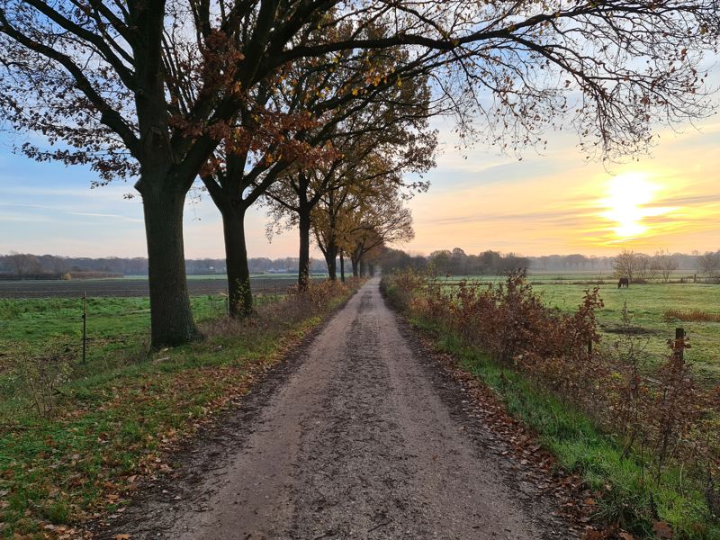 Ik word opgehaald en na een gezellig ritje afgezet bij de bushalte Rechte Heitraksedijk bij Liessel. Hier start etappe 10 van het Hertogenpad. Ik pak mijn GPS er weer bij en begin te lopen. Best een saai stukje door agrarisch gebied. Gelukkig heb ik onderweg wat aanspraak aan koeien, die belangstellend op mij af komen hollen, maar dan verlegen langs de sloot gaan staan. Ik moet lachen om de ronde billen van de varkens, die mij geen blik waardig keuren. Het is een lange rechte weg. De lage novemberzon zorgt voor wat mooie plaatjes.