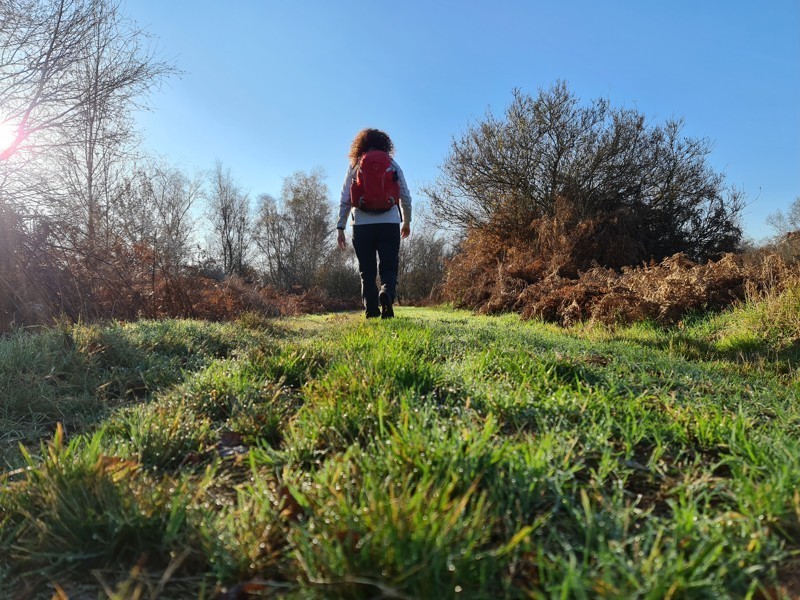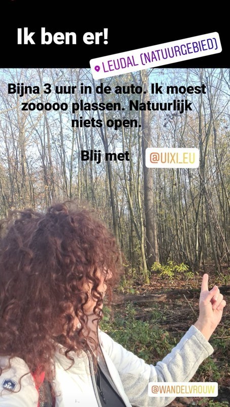 Na drie uur in de auto moet ik verschrikkelijk plassen. Alles is dicht vanwege de coronamaatregelen, dus ik wil zo snel mogelijk het bos in. Maar ik zie zo snel niet welke kant ik op moet. Ik heb helemaal geen geduld, ik pak mijn boekje van het Hertogenpad erbij en zoek naar de route. Ik gok min of meer dat ik aan de overkant moet zijn en vlucht het bos in. Het is een hele opluchting als ik met mijn UIXI, een plas kan doen. Ik maak daarover een post op Instagram Stories en een berichtenstroom breekt los. Het blijkt dat heel veel vrouwen een probleem hebben met plassen nu de horeca dicht is. Ik heb wat losgemaakt.