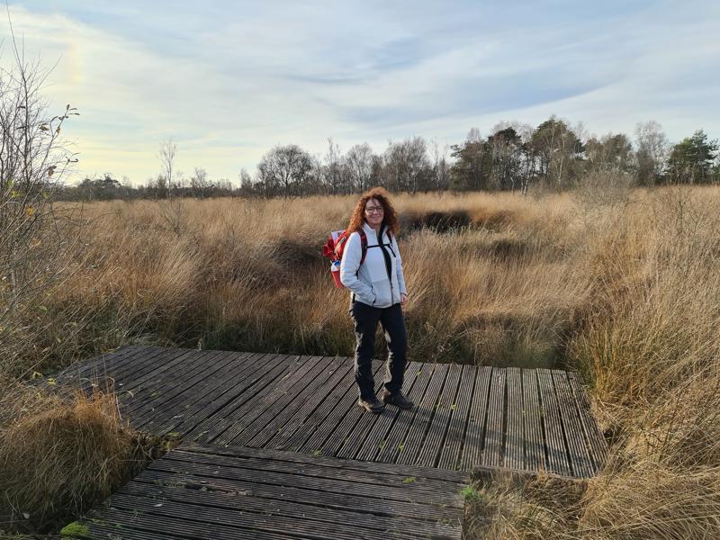 Dan kom ik bij het natuurgebied De Groote Peel. De wereld ziet er ineens heel anders uit. Alles kleurt roestbruin om mij heen, behalve het graspad dat groen, met witte dauwdruppels, voor mij uit loopt. Het is prachtig hier. Grote weidse vlaktes die een enorme rust uitstralen.