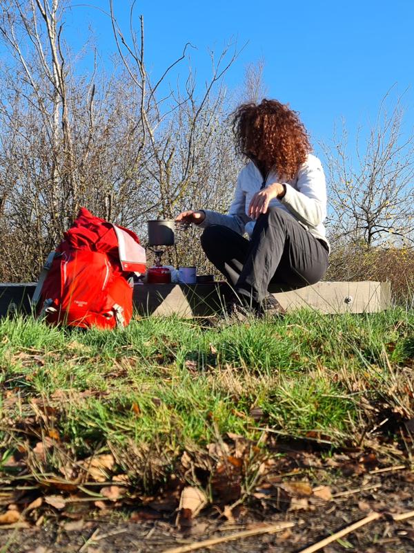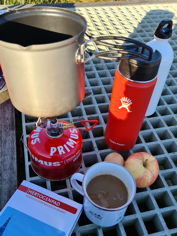 Als ik tussen wat bomen doorloop, spelen de vogels een spelletje met me. Ze vliegen steeds een stukje voor mij uit en verstoppen zich dan tussen de takken. Als ik merk dat ik totaal van de route ben afgedwaald, besluit ik om eerst eens pauze te houden. Ik heb een brandertje mee om lekkere hete koffie te zetten. Je moet toch iets, in deze coronatijden. De Pastorie heeft me verwend. Er komen allerlei lekkere broodjes uit de lunchzak.