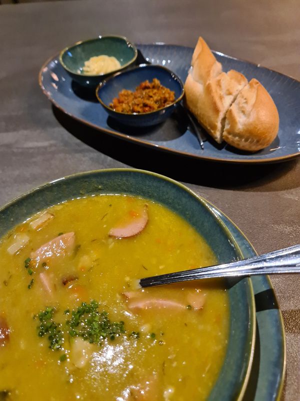 Heerlijke herfstkost na een dag wandelen; erwtensoep met worst.