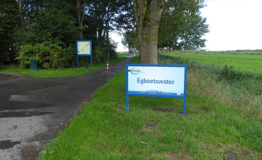 Bij de parkeerplaats staat een bord met de plattegrond van het Egboetswater. Je kunt hier goed zien wat een smalle strook het is.