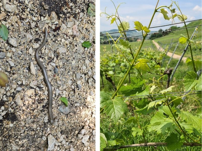 Als snel zien we de eerste bordjes. De wandeling blijkt uitstekend bewegwijzerd. We zien ook dat we hier in een beschermd natuurgebied lopen. We dalen vrijwel meteen via een weiland de berg af. Daar is een boer bezig het gras te maaien met een tractor. We geloven onze ogen niet: Achter de maaimachine lopen 3 ooievaars te pikken tussen het pas gemaaide gras en boven onze hoofden cirkelen een aantal roofvogels die speuren of er iets te eten voor hen is. We herkennen ze niet allemaal, maar er zitten zeker valkjes bij en rode wouwen. Het is een magnifiek gezicht. De valkjes bidden boven het grasland en duiken zo nu en dan naar beneden. Omdat wij nog hoog op de berg staan, zijn we soms op gelijke hoogte met de vogels. Het is een zo’n mooi schouwspel, dat we besluiten om op het gras te gaan zitten en hier alvast te lunchen.