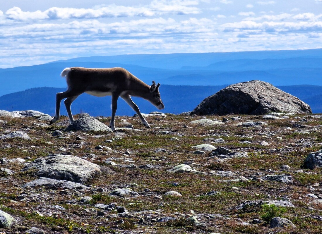 Aan onze linkerhand verspert de berg Sjöhogda ons zicht op het meer. Antonette stelt voor om de berg te beklimmen. Ik twijfel even, maar waarom eigenlijk niet. We gaan van het pad af en beklimmen de berg. Wat we eerder niet zagen is dat er verschillende rendieren op de berg lopen. Super leuk.