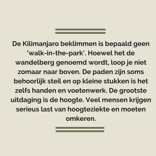 Het jaar daarvoor ben ik wel op ca 6.000 m hoogte op de hellingen van de Everest geweest en het jaar daarvoor heb ik op de Elbroes gestaan. Dus ik dacht dat de Kili voor mij wel haalbaar zou zijn. Helaas niet dus.
