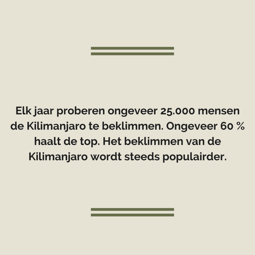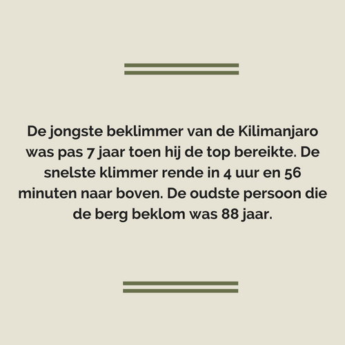 Hoi Bergje ik heb je verhaal gelezen en dat heeft mij geïnspireerd Ik heb de Kilimanjaro opgewandeld januari 2019. Over kleine 2 weken ga ik nog een keer terug om zusje Mt Meru te bewandelen. Ze zeggen dat die niet onderdoet en op de laatste dag zelfs zwaarder is dan de Kili. Ik ga het beleven. Ik hem met name veel gehad aan je tips qua voorbereiding.