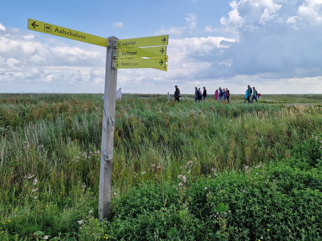 We ontbijten, lummelen, trekken er op uit om de veerboot te zien aankomen. We willen graag mee op excursie met een gids, maar wisten niet dat we een plekje moesten reserveren. Daarom hopen we dat we alsnog mee kunnen, ondanks dat de groepen vol zitten. Met hulp van de betaalde kracht van Natuurmonumenten die het vrijwilligersleger aanstuurt, kunnen wij en nog een gezin uit één van de andere huisjes, toegevoegd worden aan de groepen. Super!