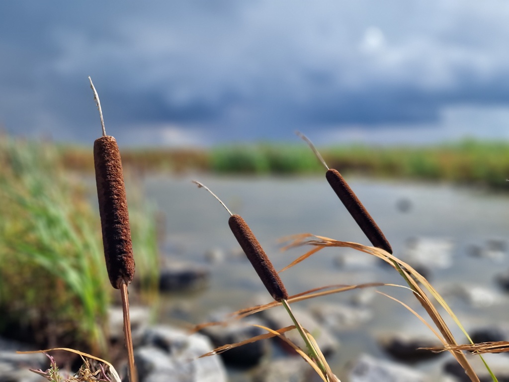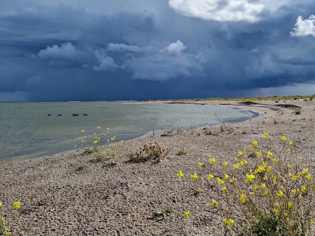 Het mooie van op het eiland wandelen is dat je je heel bewust bent van de lucht en de wolken. Het is er weids en we speuren steeds naar vogels en kijken vooral of we de zeearend kunnen spotten. Die schijnt hier dagelijks over te vliegen. We zien wel de kiekendief en vele andere kleinere vogelsoorten, maar de zeearend laat zich niet zien. Het raast van de oeverzwaluwen en ik vind het leuk om te zien hoe de visdief in de lucht hangt om daarna naar beneden te duiken om een visje op te halen.